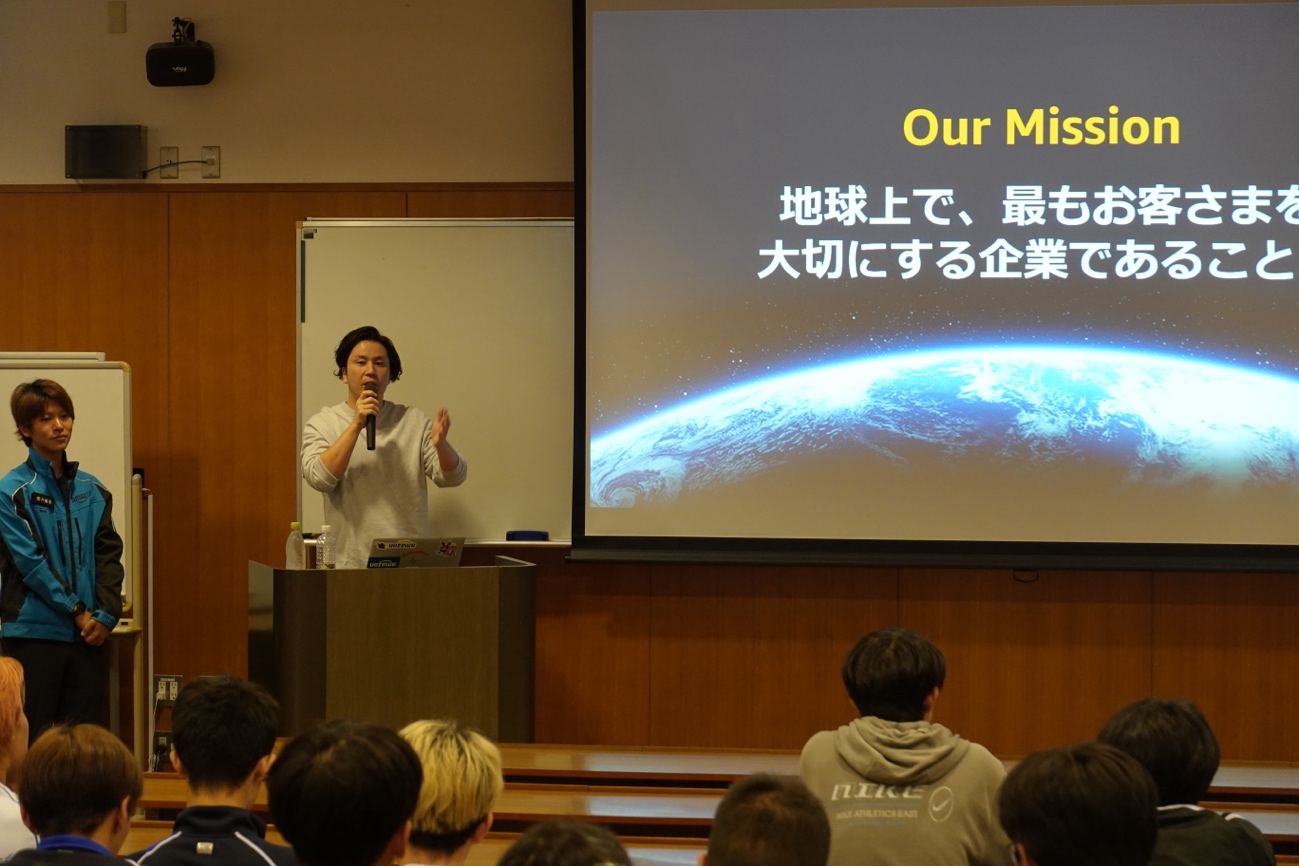 今回は、世界的企業であるアマゾンジャパン合同会社より、情報工学科OBの荒井颯志氏と、新卒採用担当リクルーターの加藤功氏をお招きし、「グローバル・カンパニーで歩む高専リーダのキャリア」をテーマにご講演いただきました。