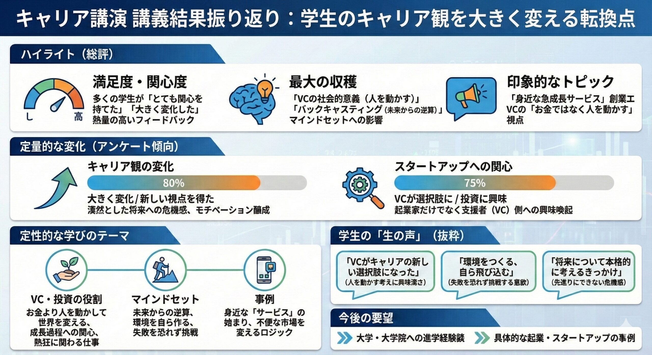 本講演は、スタートアップや VC の仕組みの理解にとどまらず、「どの環境を選び、どう挑戦するか」というキャリアの核心に迫る機会となりました。参加学生からは、「起業や VC が身近になった」「未来から逆算する発想が新鮮だった」などの声が寄せられました。