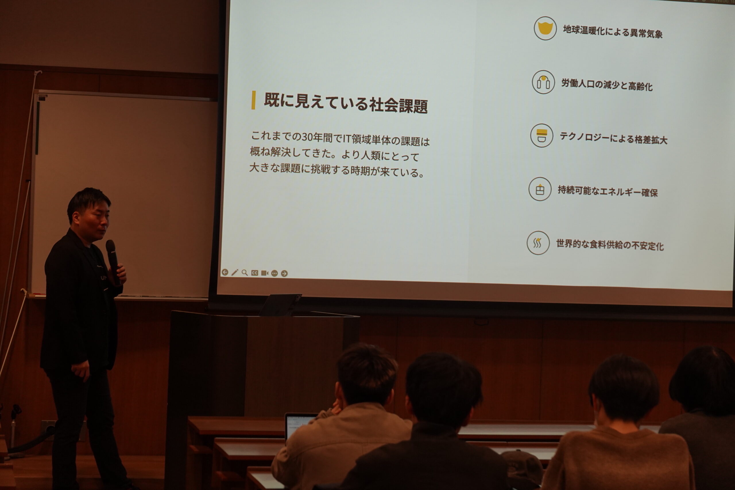 後半では、気候変動・エネルギー・AI・ロボティクスなど、今後 10〜20 年で変化が見込まれる社会課題を踏まえ、理想の未来像から現在の行動を逆算してキャリアを設計する考え方が紹介されました。政府・国際機関の公開データや技術トレンドを参照し、伸びる領域と自分の関わり方を見極める視点が示されました。