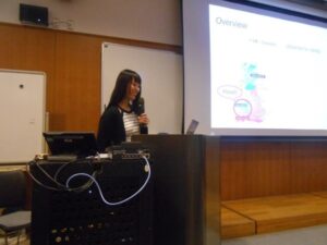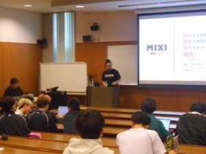 MIXIは、スポーツ、ライフスタイル、あるいはデジタルエンターテイメントを主な生業にされています。スマホで有名なゲーム等があるそうです。本日は、ゲームプログラミングで驚きを表現するためには数学が重要な事、コミュニケーションを取るには相手との距離感が大事等を話されました。また、たくさんの学生の質問に丁寧に回答されていました。村瀬様ありがとうございました。