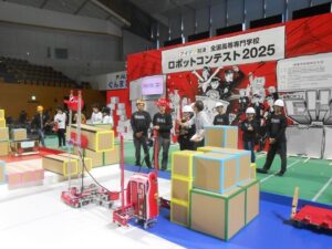 2025年10月12日、高専ロボコン2025関東甲信越地区大会がALSOKぐんま武道館でありました。本校から2チームが参加しました。Aチームは、決勝トーナメントに進みましたが準決勝で負けました。しかし、Aチームは本地区大会でゲートを高く積んだことが評価され、11月16日に国技館で開催される高専ロボコン全国大会に出場することになりました。Bチームは“たこ”のデザインが評価され安川電機特別賞を受賞しました。両チームともおめでとうございます。