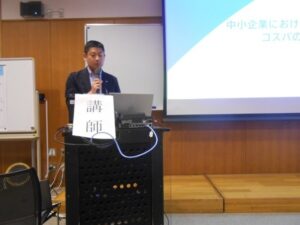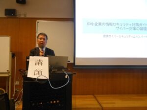 講演は、鹿島建設株式会社の田口慶様から「中小企業の情報セキュリティ対策ガイドラインから考えるサイバー対策の基礎」、ALSOK株式会社の熊谷拓実様から「中小企業におけるサイバー被害の状況とコスパのいいセキュリティ対策」についてお話がありました。最近、日本を代表するような企業にサイバー攻撃が発生しており、とてもタイミングのよい内容となりました。講師の田口様および熊谷様、ありがとうございました。