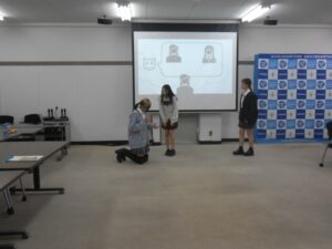 2025年10月29日、第19回全国高等専門学校英語プレゼンテーションコンテスト(英語プレコン)応募の動画を作成している現場をのぞいてみました。チーム部門に応募するとのことで、3人が1つのテーマを10分間で発表します。撮影した動画を事務局に送り、エントリー予定の20校から8チームが全国大会に出場できます。審査結果を待ちましょう。
