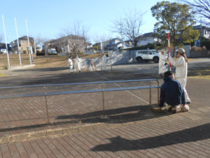 縮尺1/200の平面図をつくる実習で、本日を含め3回の実習で学内の建物等の平面図を作成するようです。屋外作業なので、日差しが無い場所や風が吹くだけで、作業時間や成果に影響しそうです。寒い中、楽しそうに実習していました。