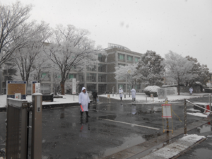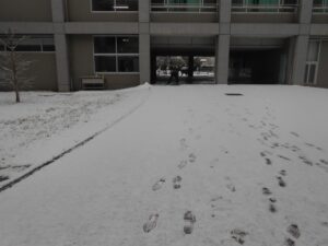 2026年2月8日の朝、雪が積もっていました。日曜日ですが、この日は学力入学者選抜試験です。試験に影響がないよう除雪が必要でした。前日の天気予報で雪が予想されており、職員の中には学校に前泊した人もいたようです。どうしてこの日に雪が降るのか不思議です。学力試験は国立高専で一斉に実施されます。他高専も同様のことがあったかもしれません。
