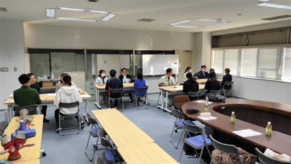 当日は,企業団の組織や業務について説明いただいた後,学生と職員の方々が2人ずつのペアに分かれて座談会が行われました。ご参加いただいた職員8名のうち4名の方が本校環境都市工学科の OB・OG だったこともあり,学生たちはリラックスして話ができたようです。各テーブルでの10分間の対話を4回繰り返す形式で行われ,学生たちは「すごく充実していた。色んなことが具体的に聞けた」と口をそろえて喜んでいました。