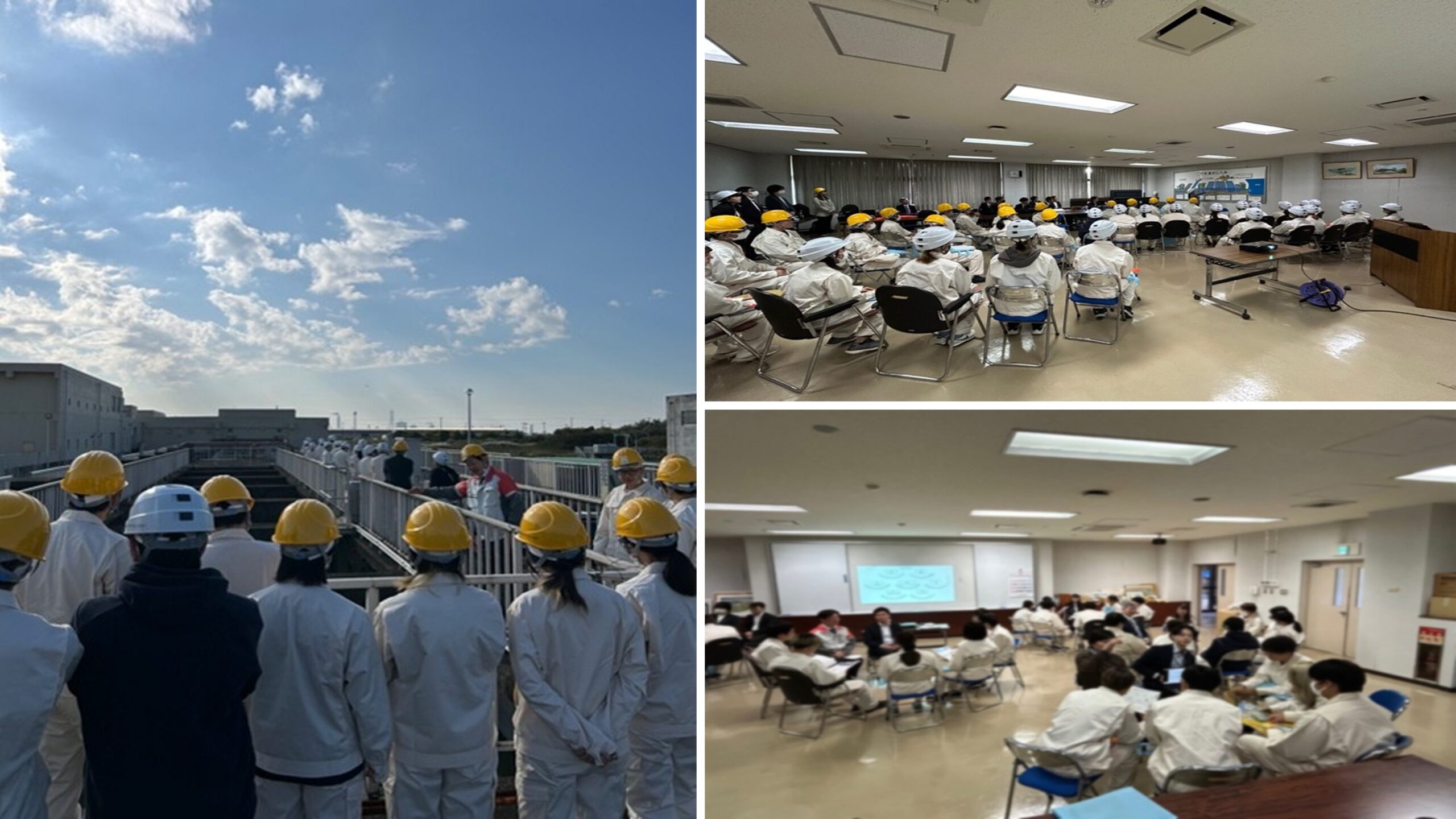 見学時には,ヘルメットのあごひもを調整して着用するだけで学生の気持ちは高まり,座談会では業務内容や福利厚生など,なかなか鋭い質問が飛び出すなど,積極的な姿勢が印象的でした。卒業後の進路を考え始めるこの時期に,貴重な学びの機会になったことと思います。