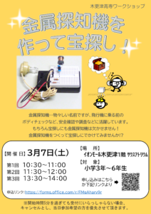 イオンモール木更津で、ワークショップ「金属探知機を作って宝探し!」を開催します。 詳細は、下記とチラシをご覧ください。