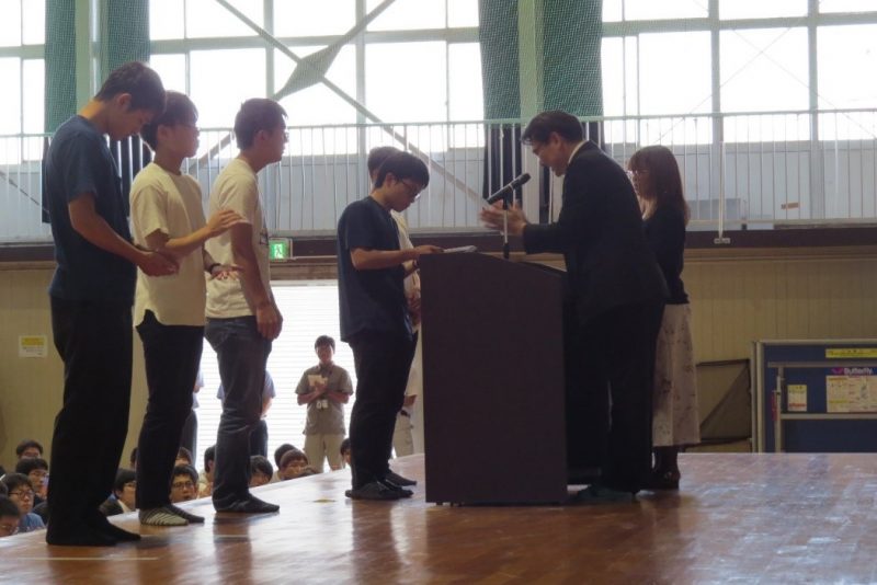 10月1日(火)本校第1体育館において、全校集会時に冠奨学金の授与式を行い、本校優秀学生賞を受けた5名のうち、学生委員会による審査の上選ばれた4名に授与いたしました。 授与式では、冠奨学金は日本製鉄株式会社様、ヤスミ資材株式会社様、ならびに田井俊行様より、本校創立50周年を記念して賜りました寄付金から授与される旨、学生に告知し、佐久間校長より目録が手渡されました。4人の受賞者は、在校生や教職員から祝福を受け、皆、晴れやかな表情を浮かべ、彼らの今後の活躍が期待される場となりました。