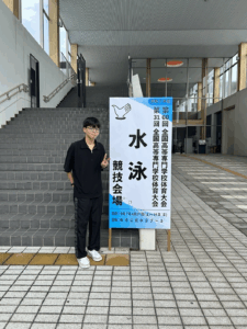 8月23日・24日に本校水泳部は、鹿児島県鹿児島市の鴨池公園水泳プールで開催された全国高専体育大会(水泳競技)に参加しました。今年度は私、男子一名が出場しました。