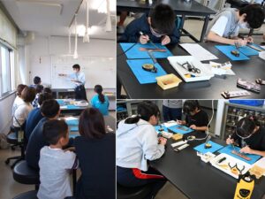 この電子オルガンは、電子制御工学科の教職員が開発したもので、手のひらサイズのオリジナル基板に指先サイズの小さなコンピュータとスピーカー、電池ケースをはんだ付けして作成します。最初に動作のしくみやはんだ付けの方法について説明を受け、その後は電子制御工学科の学生5名のサポートを受けながら製作を進めました。まずは練習用の基板や部品を使ってはんだ付けする練習をして、本番用の基板に部品をはんだ付けし、アルミテープを貼って穴を開けた鍵盤シートを基板に貼り付けて、全員無事に完成となりました。