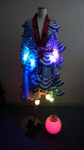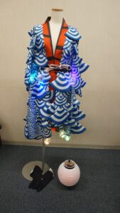 ドレスデザインは、モデルさんのヒアリングに基づきコンセプトを策定し、南総里見八犬伝から着想を得て「八魂の導」が作品名となりました。木更津高専ならではの電子工作も採り入れました。提灯はボリュームのつまみを回すことで色を自由に変えられるようにして、LEDの光が「八魂の導」のメタファーとなりました。フォトブースは、木更津高専美術部が主担当となって制作しました。鶴田氏のイラスト、青海波とともに君津市の市花である「牡丹」の組み合わせによるフォトブースが、会場に彩を与えることとなりました。