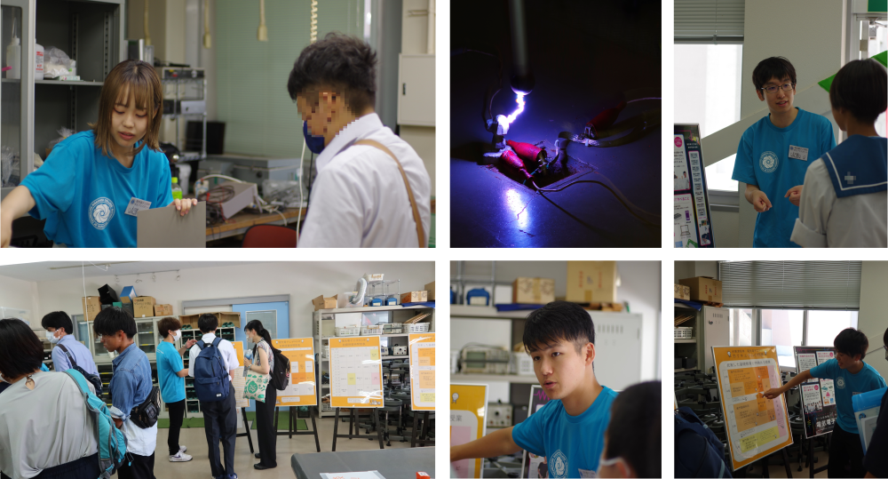 電気電子工学科では、本学科の専門分野や時間割、進路のなどの特徴を説明し、これまで学生が作製した成果物を展示いたしました。また、電磁波やロボットアームや電気モータの実験装置、落雷の模擬実演等、電気電子工学科で行っている研究室の紹介も行いました。